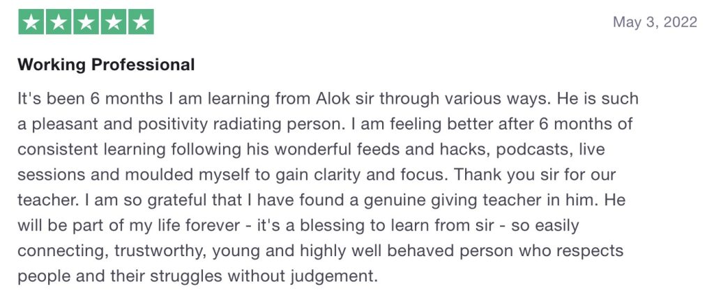 “Alok is a great mentor and coach. His concepts really helped me to come out of my mental struggles and challenges. Thanks for being my support system and helping me to become a better version of myself.”