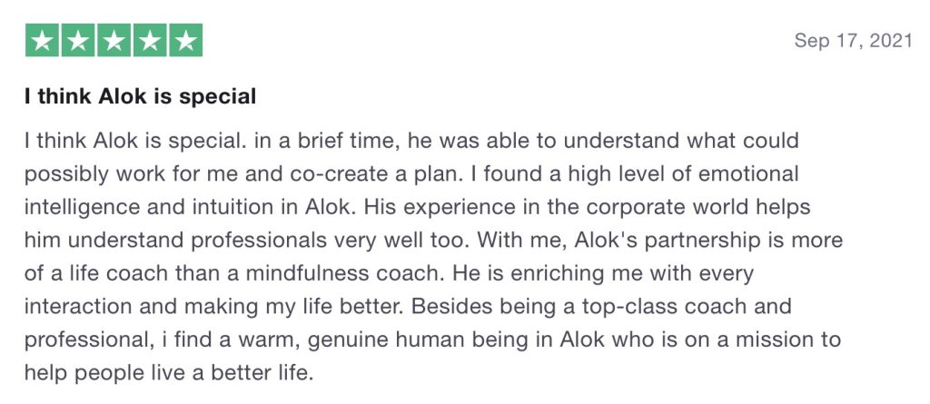 “Alok is one of the great professional life coaches. Alok not only helped me master my emotions but also helped to get clarity on my goals & gain confidence to breakthrough my limitations.”
